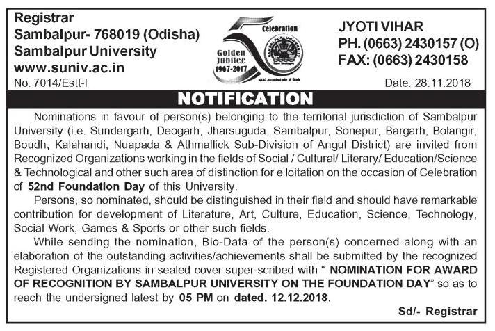 3415 04/12/2018 The Twenty ninth Convocation of the Sambalpur University will be held on sturday, the 5th day of January, 2019 at 10.00 AM at he Biju Pattanaik Auditorium of the University at Jyoti Vihar, Burla